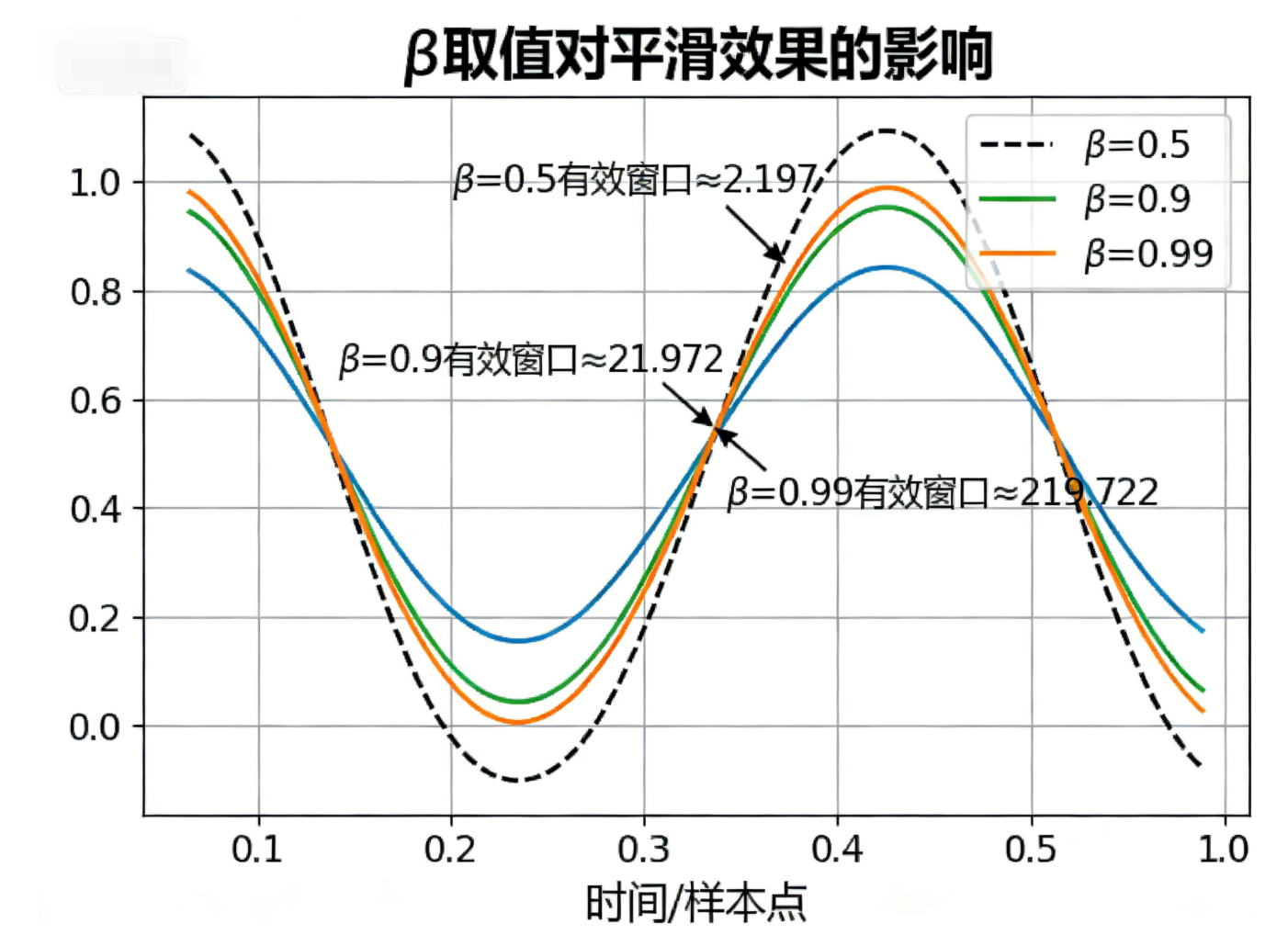 β \beta β是EWA唯一的超参,它的取值直接决定平滑效果和响应速度,核心规律的是: β \beta β越大,平滑效果越强,响应速度越慢; β \beta β越小,响应速度越快,平滑效果越弱。