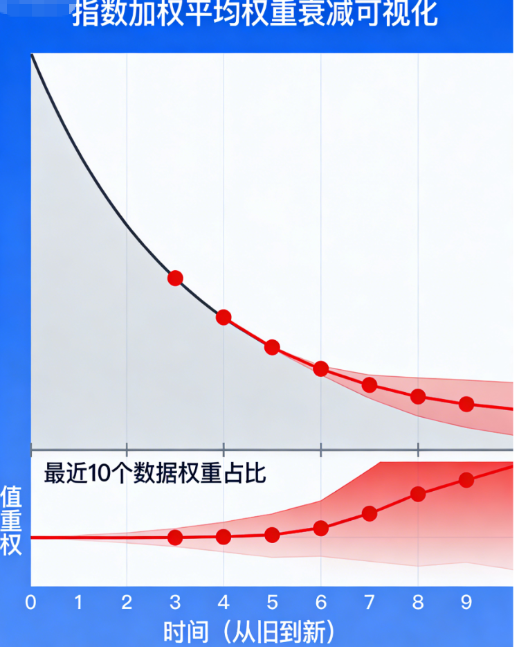 EWA的出现,就是为了"平滑这些噪声"------它通过对历史数据按「指数级衰减的权重」做加权平均,让越新的数据权重越高、越旧的数据权重越低,既保留了新数据的响应速度,又过滤了旧数据的噪声。