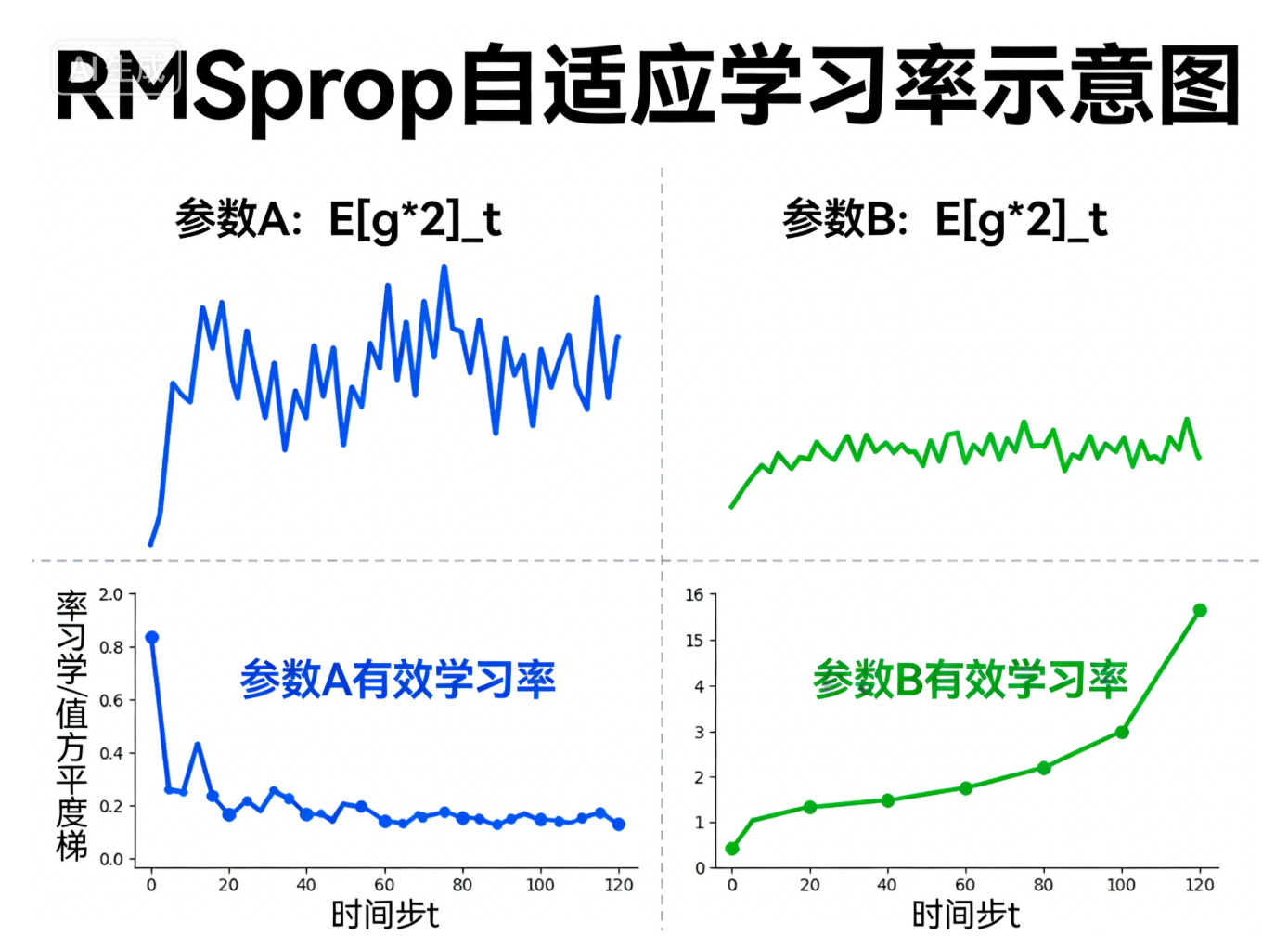 RMSprop(Root Mean Square Propagation,均方根传播)是在Momentum基础上的第二次"升级",核心目标是「解决"学习率固定"的痛点,为每个参数自适应调整学习率」------它的核心思路是:用EWA平滑梯度的平方,再用其平方根缩放学习率,让梯度波动大的参数学习率变小,梯度波动小的参数学习率变大。