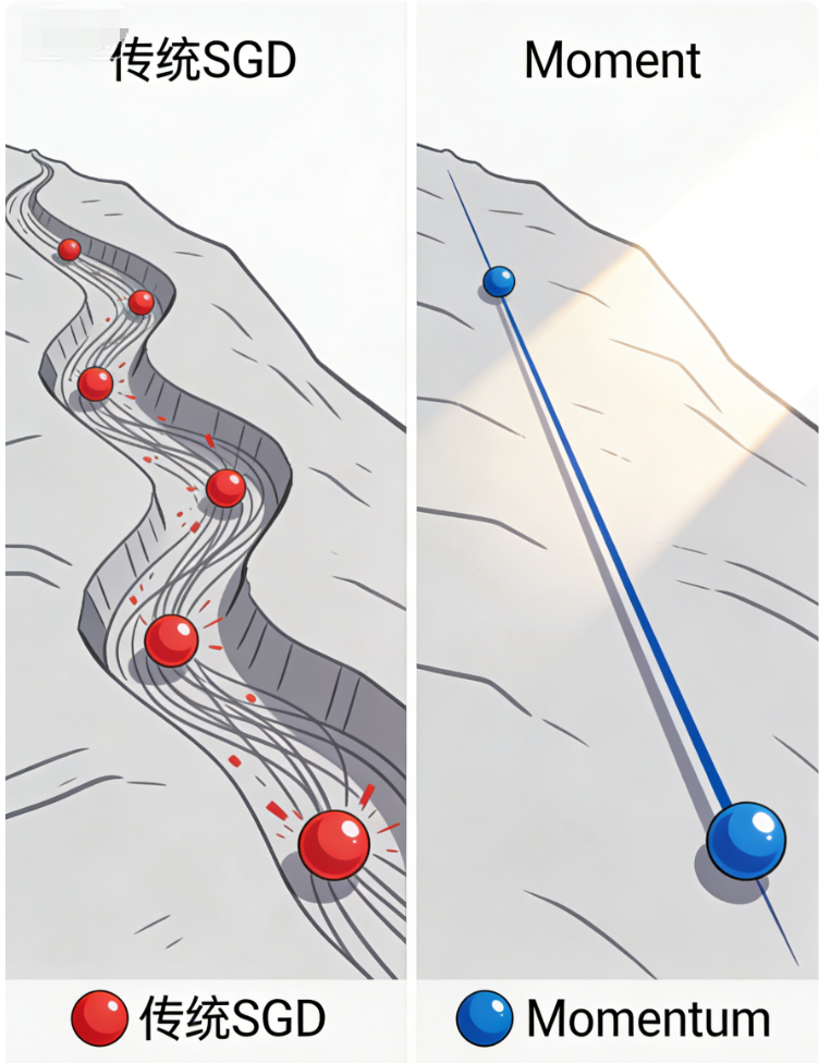 举个例子:就像一个小球从山坡上滚下来(目标是滚到山底,即最优解),传统SGD的小球会在山坡的沟壑中来回碰撞、震荡,很难快速滚到山底;而Momentum给小球加上"惯性",让它忽略小的沟壑(噪声),沿着山坡的整体趋势快速下滑。