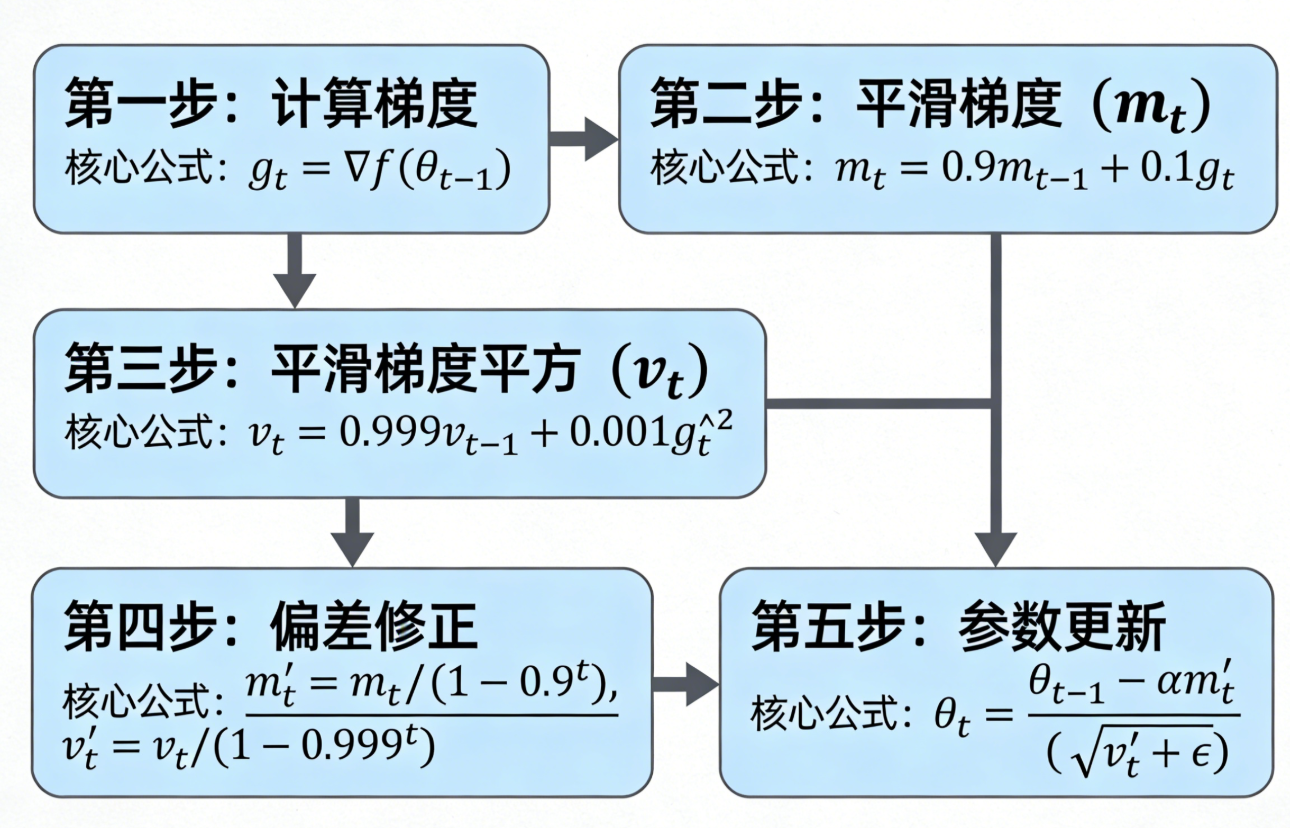 Adam的核心逻辑分为三步,本质是"同时平滑梯度和梯度平方,再结合二者更新参数":