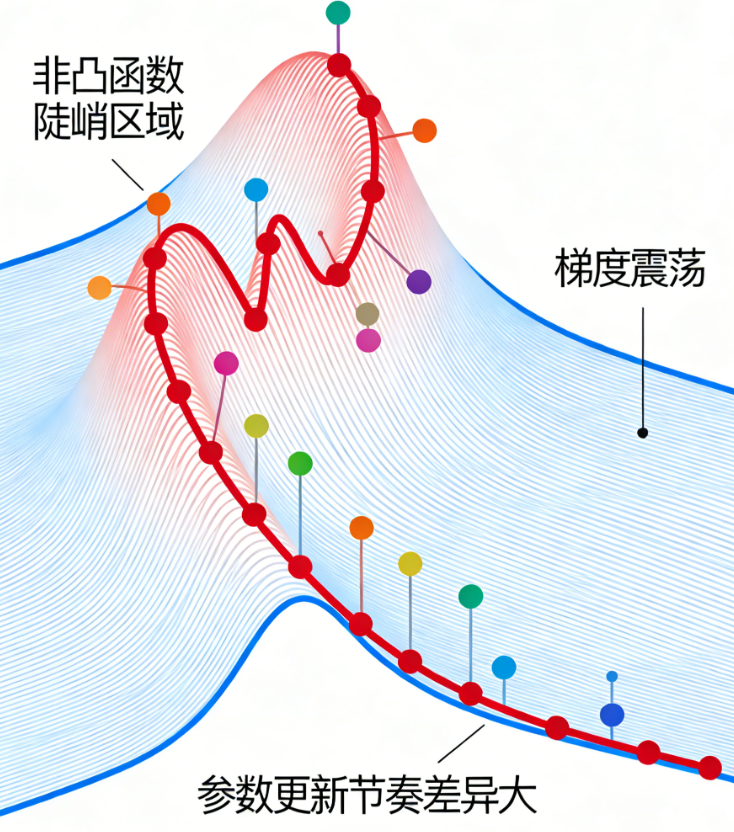 传统SGD的最大痛点之一是「梯度震荡」:当训练数据存在噪声,或者模型损失函数是非凸函数(大多数深度学习模型都是非凸)时,梯度会出现剧烈波动,导致参数更新在最优解附近来回"摇摆",收敛速度极慢。