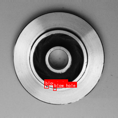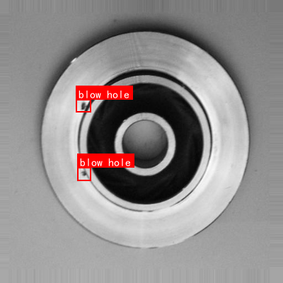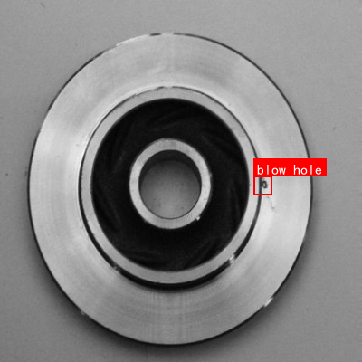 这是一张展示铸造零件的灰度图像,主体为圆形金属部件,中心有环形孔洞结构。图像中清晰标注了两个"blow hole"(气孔),分别位于黑色环形区域的上部和下部,气孔呈现不规则小孔状,是典型的铸造过程中气体未完全排出形成的内部缺陷。从视觉特征看,该零件表面光滑但存在明显气孔瑕疵,气孔位置处于零件的关键受力或功能区域附近,可能影响零件的结构强度和密封性能。结合"铸造缺陷检测与分类"的任务目标,此图用于演示气孔类缺陷的形态识别------气孔作为常见铸造缺陷,其大小、分布位置及数量是评估零件质量的重要指标,通过此类图像可训练模型识别不同类型的铸造缺陷,进而实现自动化检测与分类,提升铸造产品质量控制效率。