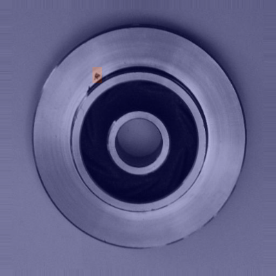 图片展示了一个圆形金属铸件的特写视图。铸件整体呈银灰色,表面具有金属光泽,中心区域为深色环形结构,内圈有一个圆形通孔。在铸件外缘靠近上方的位置,存在一个明显的橙色标记点,该标记可能是用于缺陷定位的标识。从铸造工艺角度分析,此铸件可能属于盘类零件,其外观无明显宏观裂纹或大面积气孔,但需结合专业检测手段进一步确认内部是否存在缩松、夹杂等微观缺陷。图片中橙色标记点的存在,暗示此处可能是检测关注的重点区域,符合铸造缺陷检测中"定位可疑部位"的需求------通过视觉标记快速锁定潜在问题点,后续可借助无损检测技术(如超声探伤、射线检测)对标记区域进行精准分析,判断是否属于砂眼、夹渣等典型铸造缺陷类别,从而实现缺陷的分类与评估。