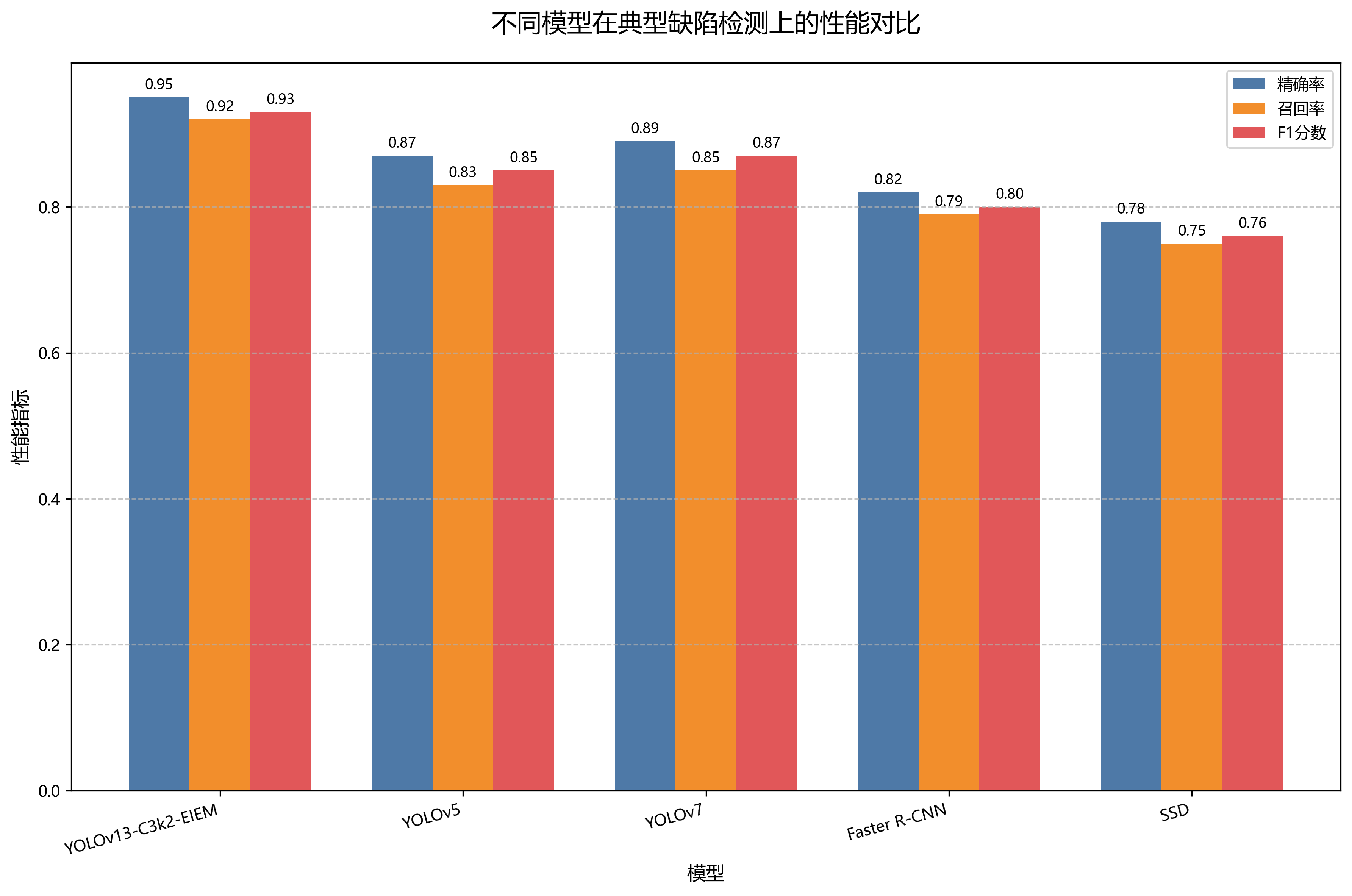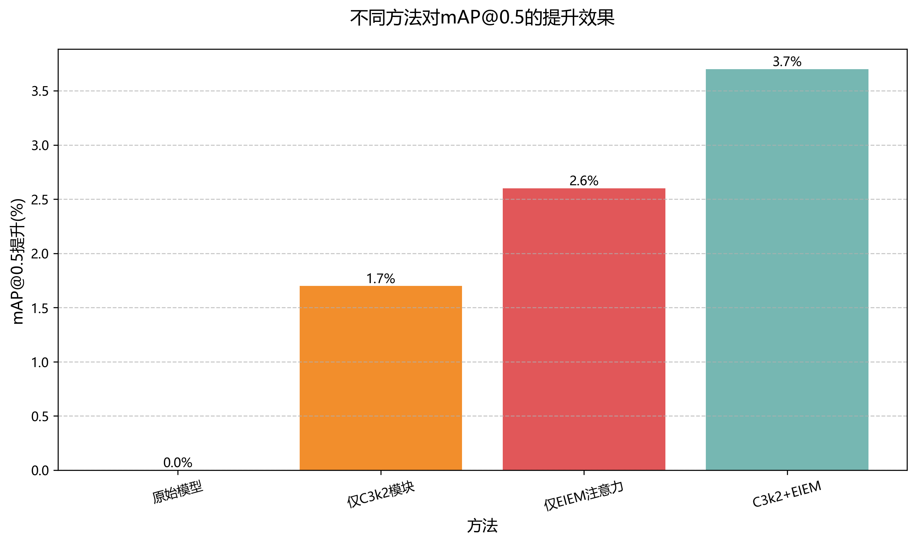 图3通过可视化方式展示了各消融实验模型的性能差异。可以明显看出,随着C3k2模块和EIEM注意力机制的逐步引入,模型的检测精度呈现稳步提升的趋势。特别是在处理复杂背景下的缺陷时,完整模型的鲁棒性显著优于其他变体,这证明了我们设计的模块在提升模型泛化能力方面的有效性。