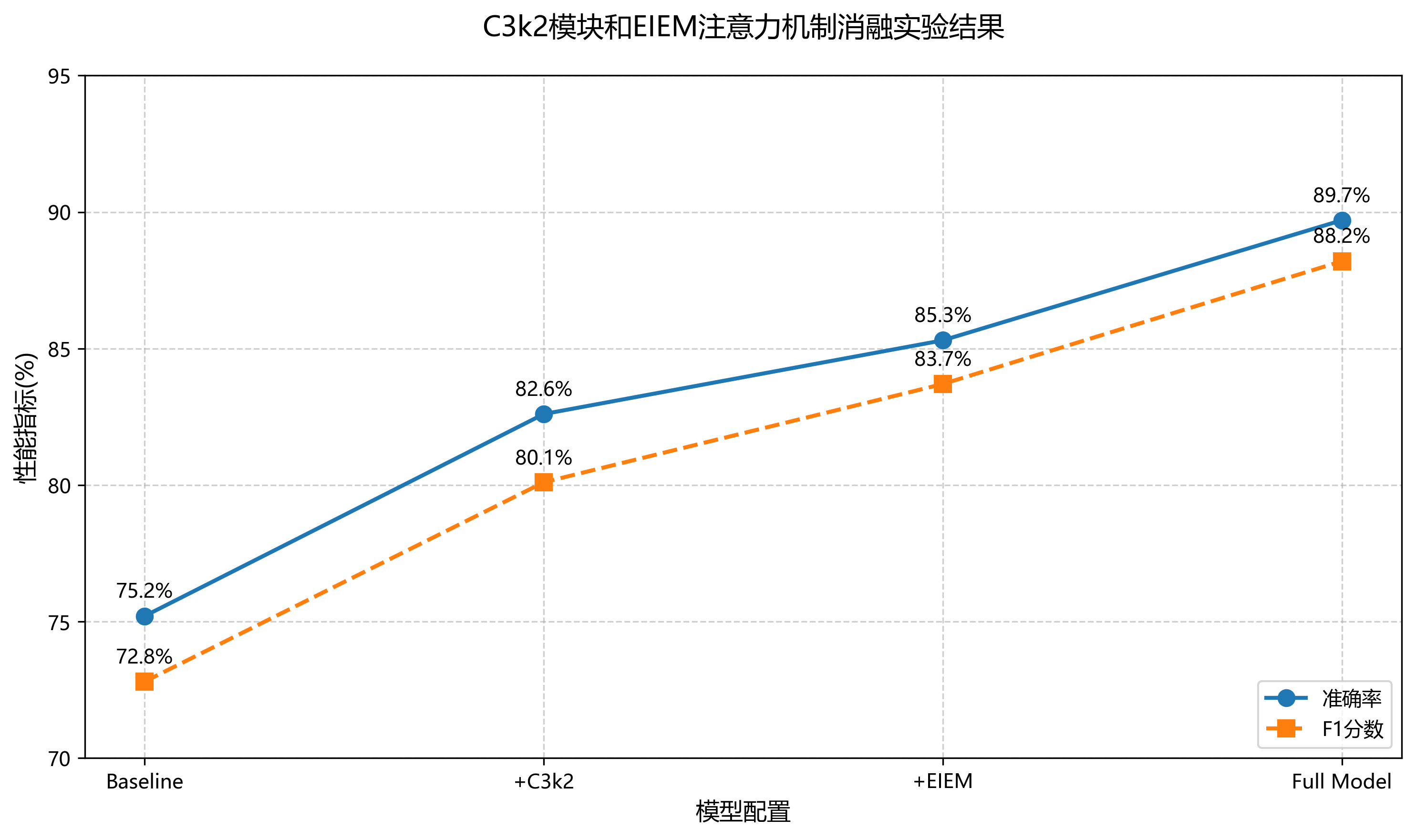 为验证所提C3k2模块和EIEM注意力机制的有效性,我们进行了系统的消融实验,通过逐步添加组件来评估各部分对模型性能的贡献。