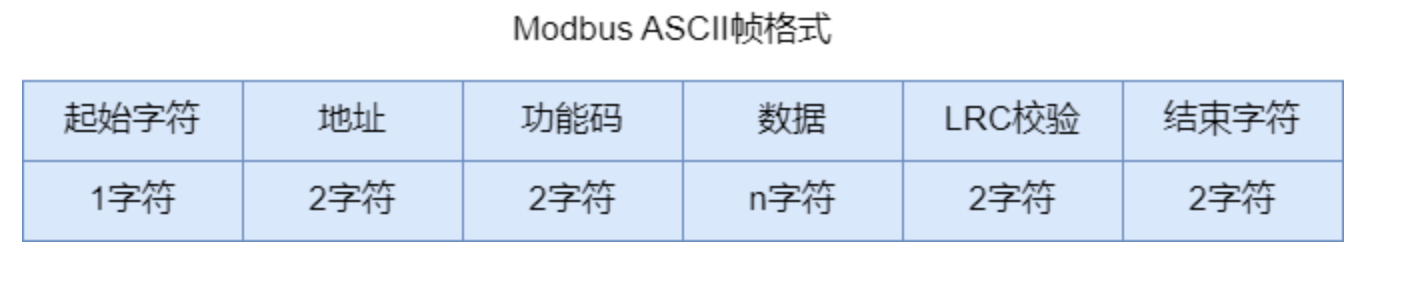 该模式以ASCII方式传输数据,在消息中每个8位的字节都将作为两个ASCII字符发送。消息以冒号(:即0x3A)开始,以回车换行符结束(0x0D),其它字段则采用十六进制为传输字符。具有文本可读,调试方便,适用于低速短距的场景。