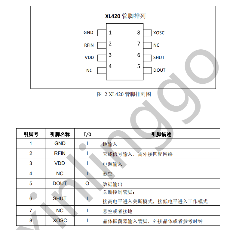 XL420 采用负阻型晶体振荡电路,将外部负载电容置于芯片内部。只需要外接合适的晶体振荡器即可提供准确的参考时钟。在 300--480 MHz 免费频段内的任何频点,实际工作频点与晶振频率的计算公式如下:FXTAL =13.52127/433.92 FRF。