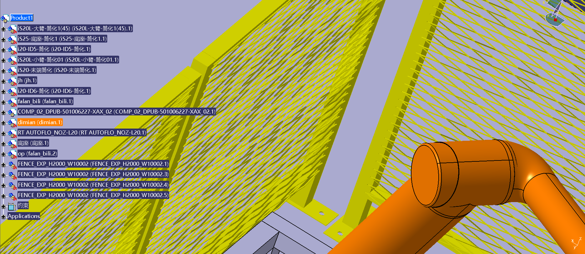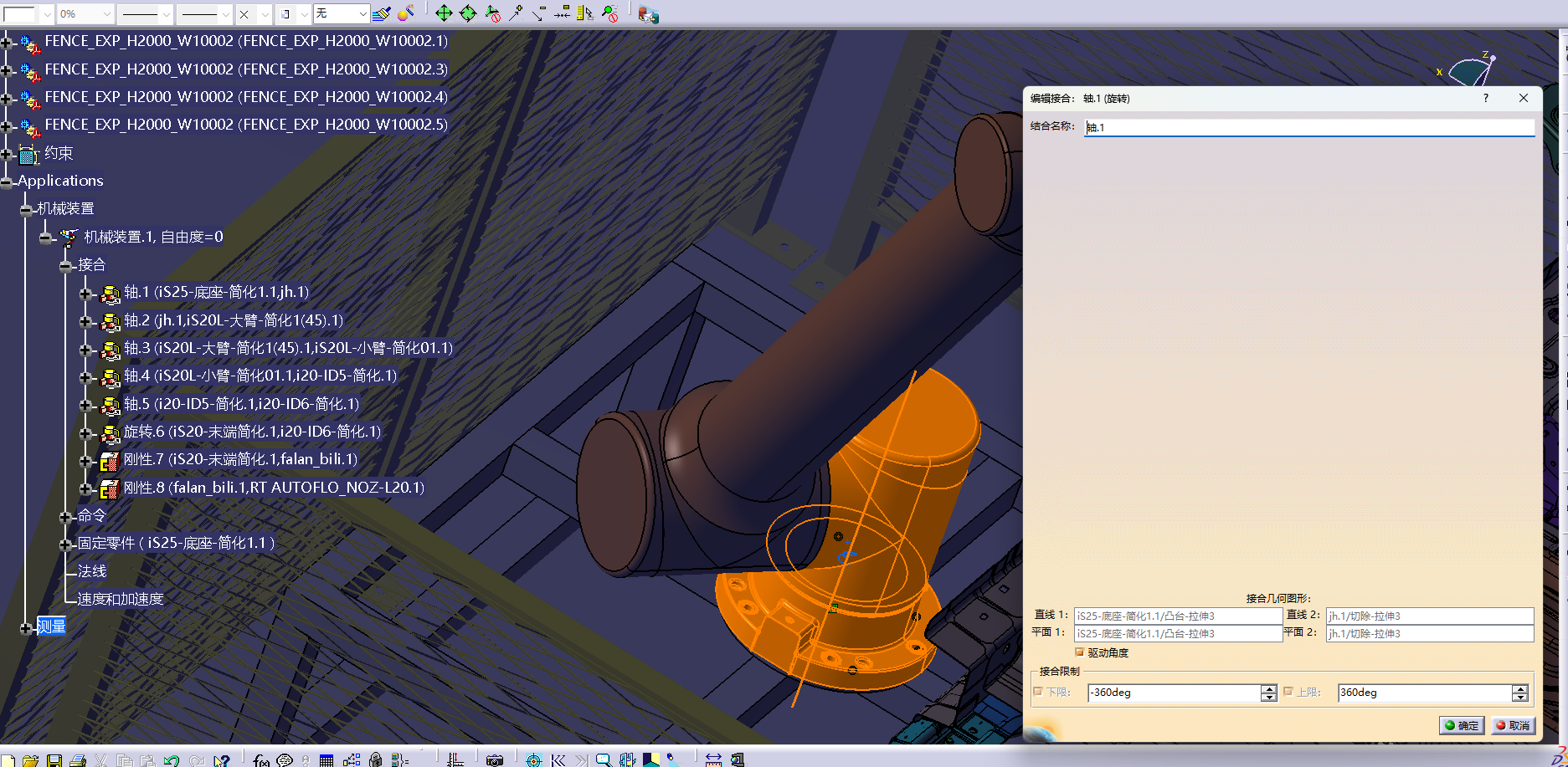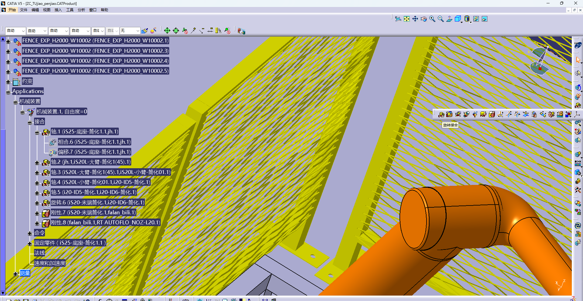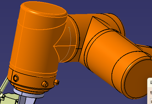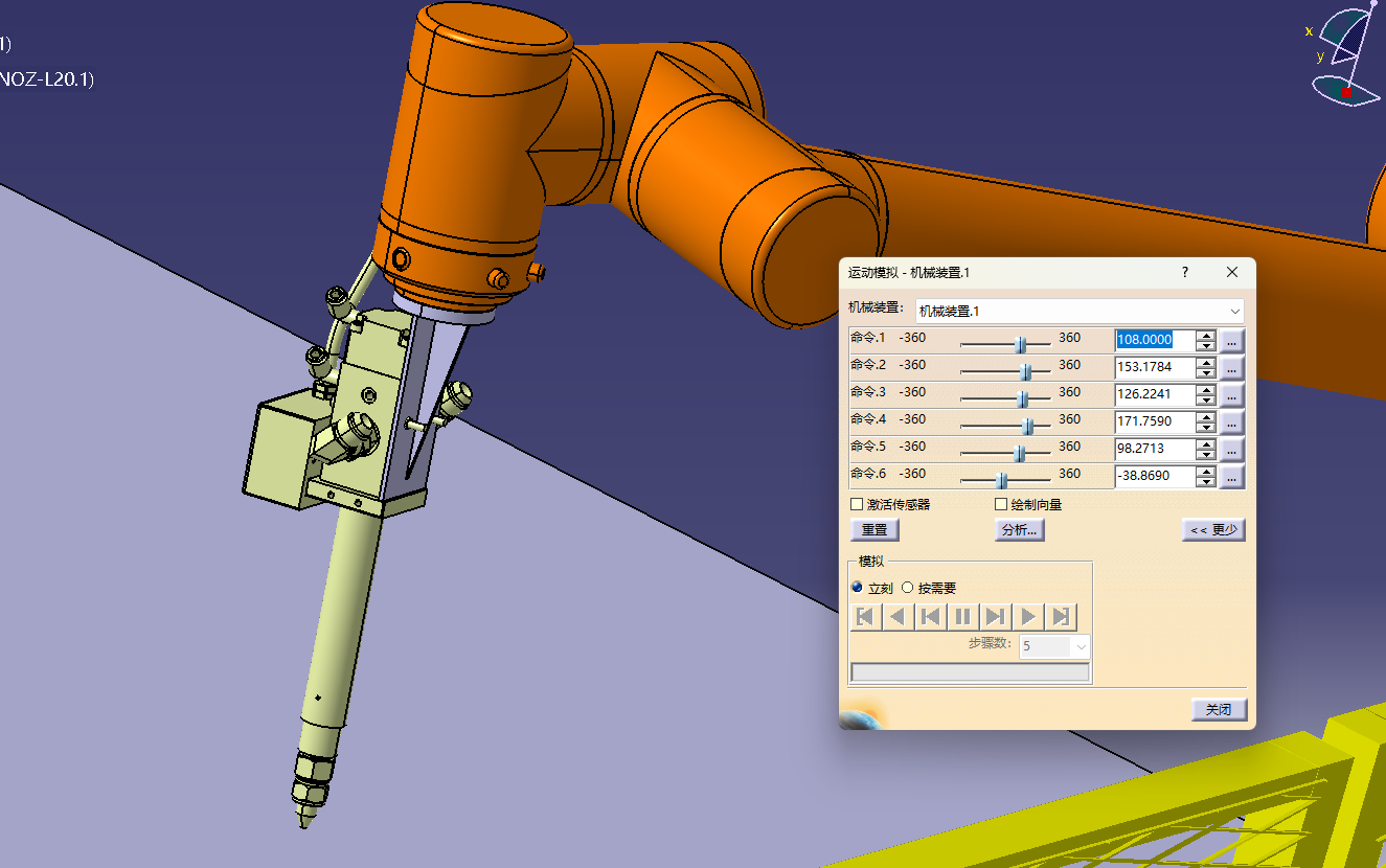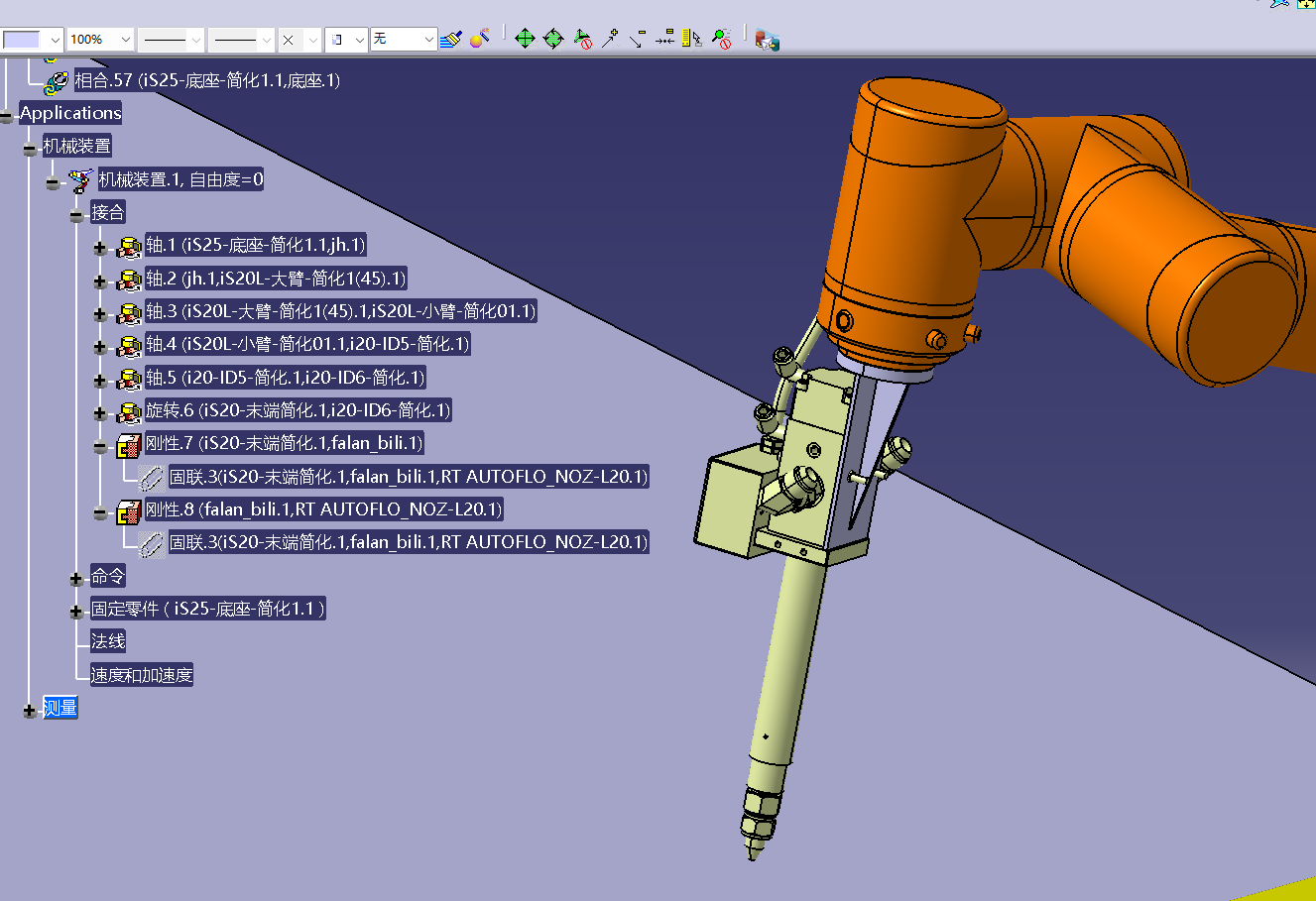 这里,灰白色的为连接法兰支架,黄色的为胶枪,首先进入装配设计,对法兰连接支架和机器人六轴法兰端面进行约束(相合和曲面约束,这里不再赘述),对胶枪和法兰支架同样进行装配设计,使其组合,如果第三方的数模的安装面无法选中,是因为格式或者设计图不对,需要进入零件设计,重新画一个薄薄的半透明安装面,使其可以被选中即可,然后进入装配设计进行安装,最后切换到DMU运动分析,进行以上application,机械装置1里面的接合,对六轴和法兰连接板,法兰连接板和胶枪,进行刚性的连接,即可完成机械装置的设定