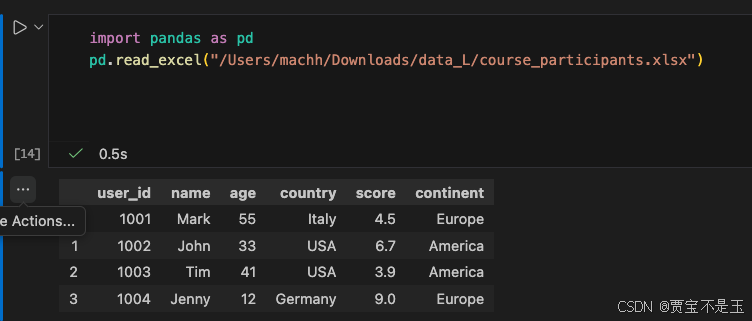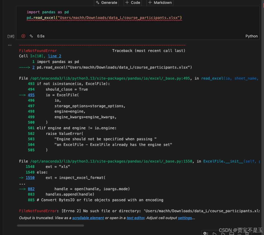 正确绝对路径:/Users/machh/Downloads/data_L/course_participants.xlsx(macOS/Linux 系统)。 - 未赋值 DataFrame 对象