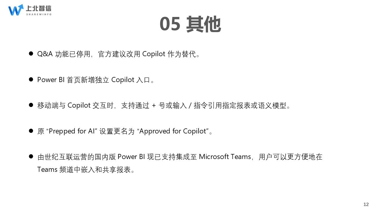 AI功能升级:Q&A功能正式停用,推荐改用Copilot;首页新增独立Copilot入口,移动端可通过「+」号或「/」指令,让Copilot引用指定报表/语义模型,分析更精准;原「Prepped for AI」更名为「Approved for Copilot」,命名更统一。