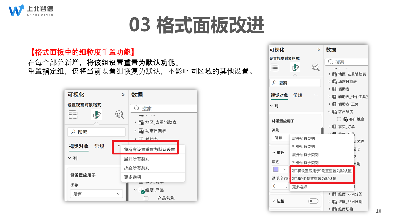 新增更细粒度的重置功能,对视觉对象的颜色、标签位置等任意一项格式设置,均可右键单独重置为默认值,无需整体恢复,调整更精准。