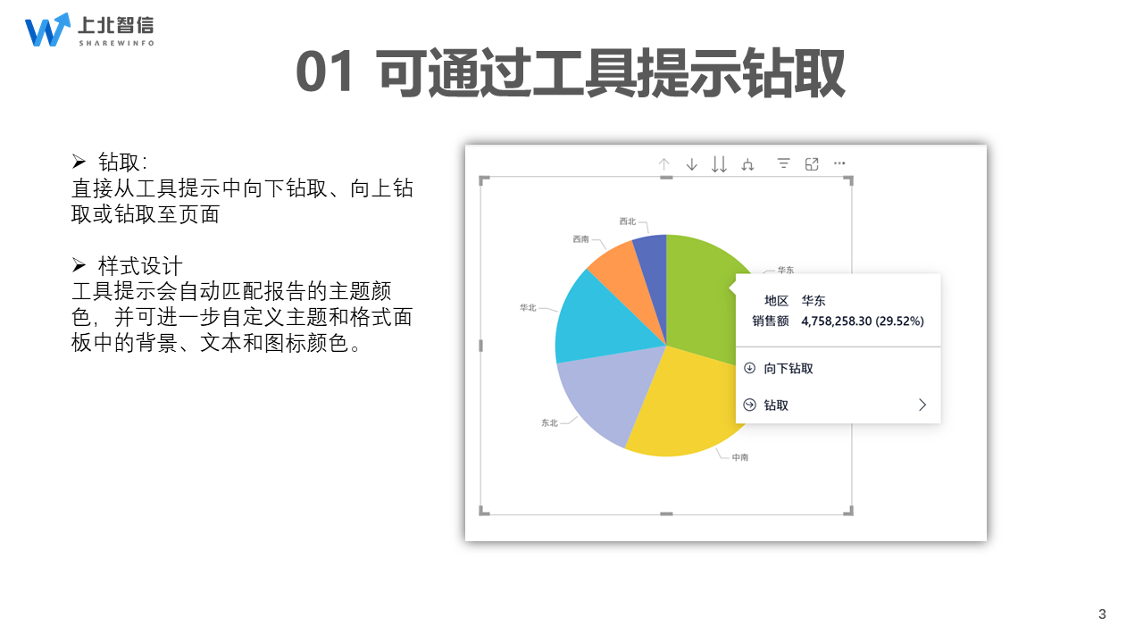 工具提示新增钻取功能,无需右键操作,鼠标悬浮在图表上,就能直接完成"向上/向下钻取"或"钻取至指定页面",多层级数据探索更便捷。