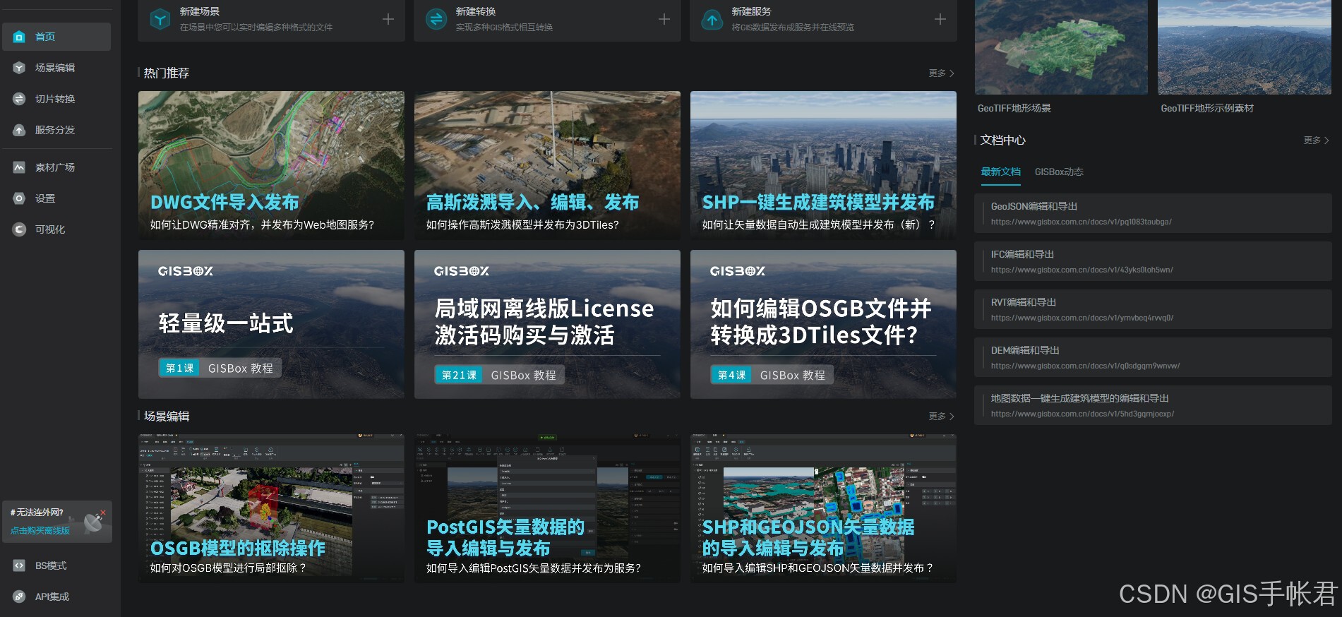 GISBox是一款三合一的GIS工具,采用全中文极简界面设计,将核心功能划分为场景编辑、切片转换、服务分发三大模块,逻辑清晰且引导性强。