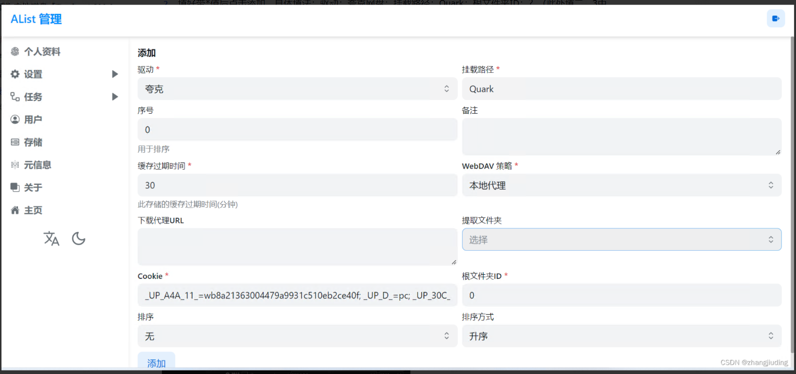 填好带*值后点击添加。具体填法:驱动:夸克网盘;挂载路径:Quark;根文件夹ID:?(此处填二、3中pdir_fid=?中的?);Cookie:(二、4中保存的cookie值)。