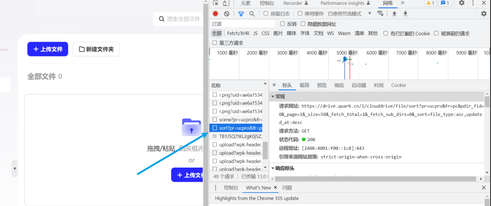 - 登录夸克网盘后,按键盘F12打开调试页面,然后在右方或下方弹出页面中点击network或网络。