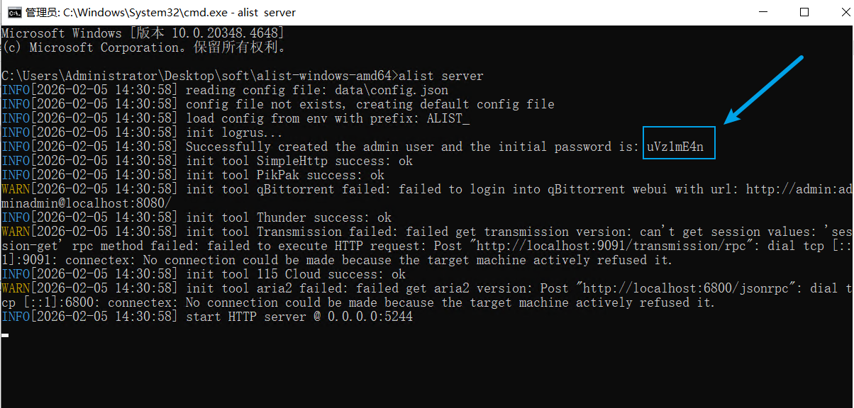 下载AList后,在软件放置文件夹地址栏输入"cmd"之后输入"alist server",如下图所以,复制密码,窗口暂时不可关闭