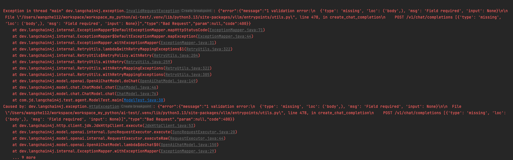 Caused by: dev.langchain4j.exception.HttpException: {"error":{"message":"1 validation error:\n {'type': 'missing', 'loc': ('body',), 'msg': 'Field required', 'input': None}\n\n File \"/Users/wangzhe112/workspace/workspace_my_python/ai-test/.venv/lib/python3.13/site-packages/vllm/entrypoints/utils.py\", line 478, in create_chat_completion\n POST /v1/chat/completions [{'type': 'missing', 'loc': ('body',), 'msg': 'Field required', 'input': None}]","type":"Bad Request","param":null,"code":400}}
