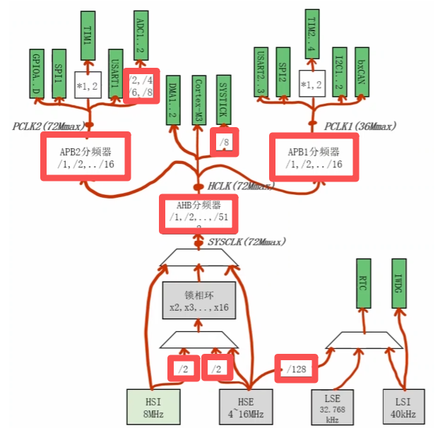 AHB,APB1,APB2的分频系数都为1