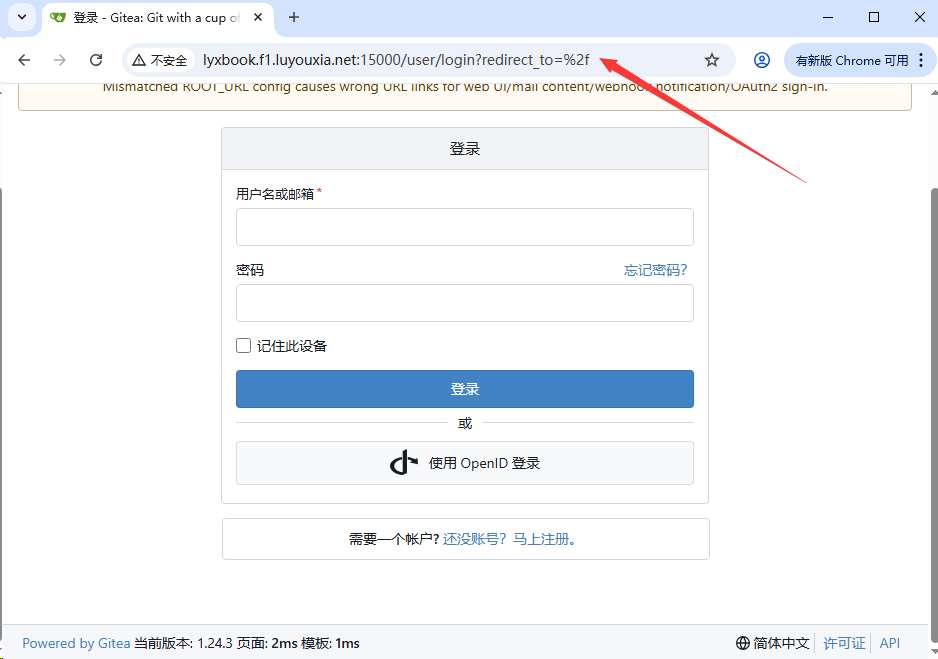 6,在外网电脑上,打开浏览器,在地址栏输入从路由侠生成的外网地址,就可以看到内网部署的 Gitea 登陆界面了。