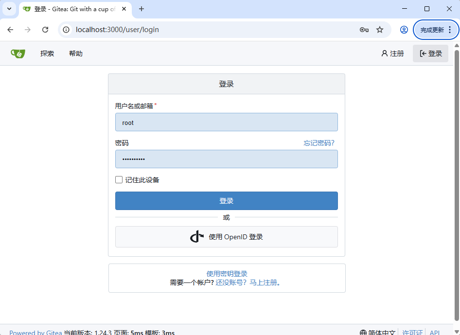 就能看到你部署的 Gitea 登录界面了。