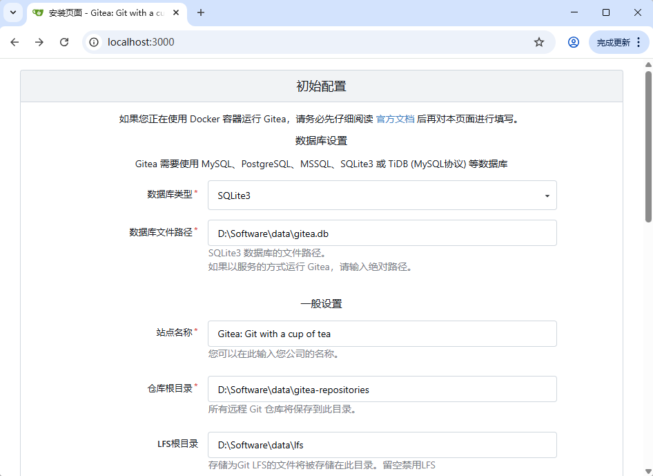 3,打开浏览器访问地址 http://localhost:3000,就能看到 Gitea 的安装界面。