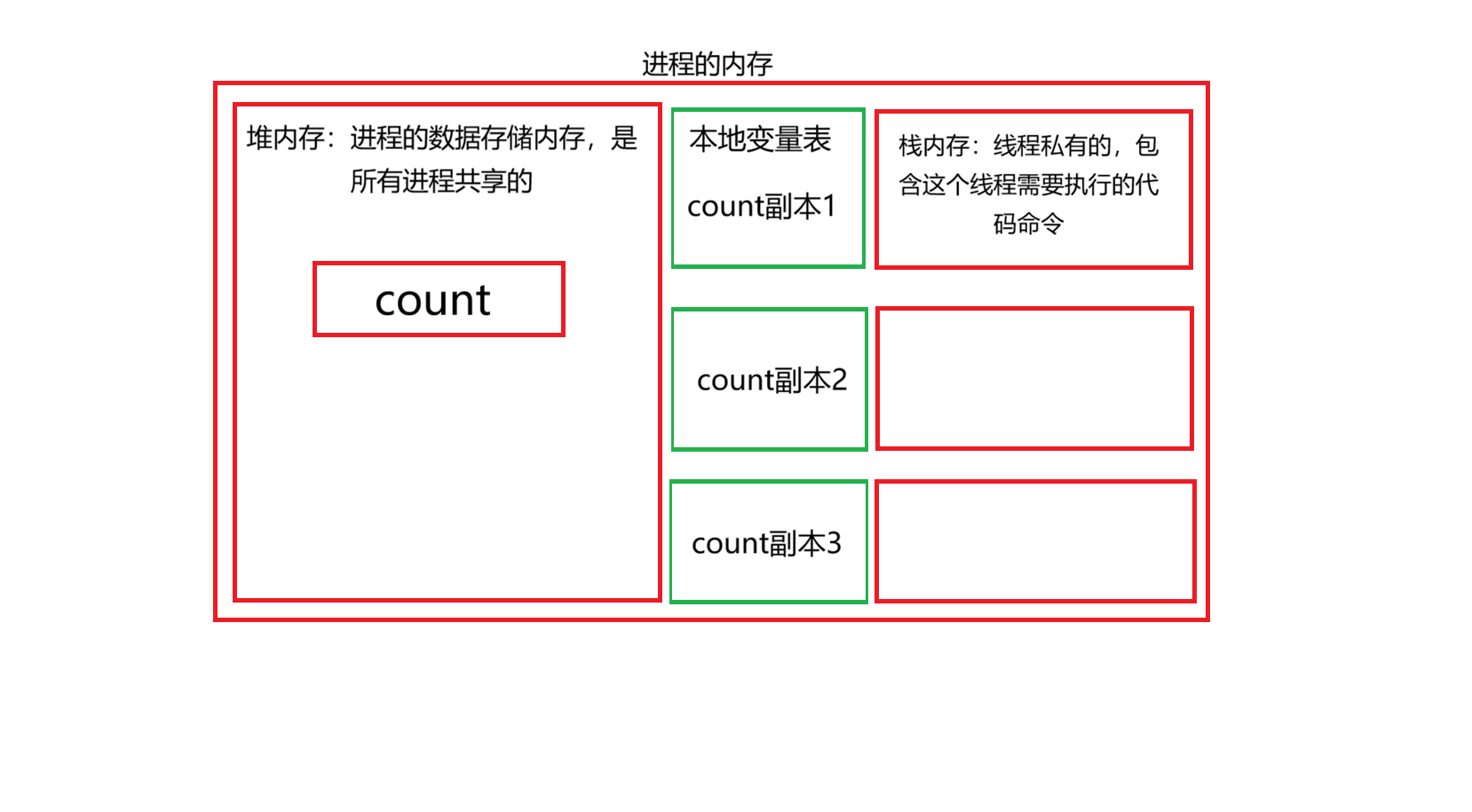 一个进程的内存包括三部分:堆内存、本地变量表、栈内存。