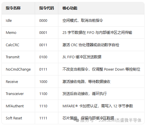 JSMCV520 的运行由内部状态机控制,通过写入 Commander 寄存器的指令代码触发,支持 9 类核心指令,与 CV520/FM17520 指令集兼容: