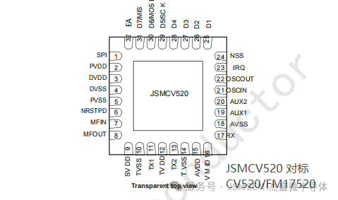 引脚定义:HVQFN32 封装的 32 个引脚功能与 CV520/FM17520 基本一致,包括电源引脚(PVDD、AVDD 等)、天线驱动引脚(TX1、TX2)、信号输入输出引脚(RX、MFIN、MFOUT 等)
