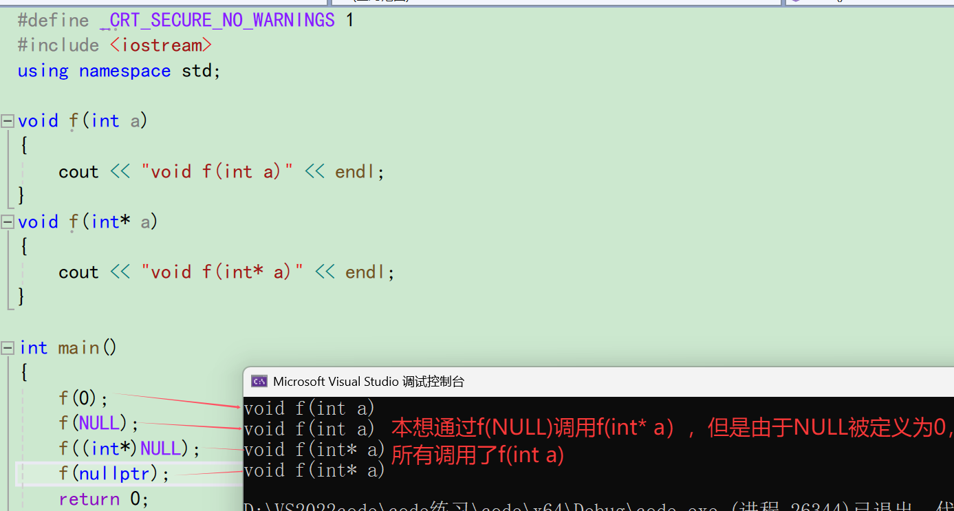 --C++中NULL可能被定义为字⾯常量0,或者C中被定义为⽆类型指针(void*)的常量。不论采取何种定义,在使⽤空值的指针时,都不可避免的会遇到⼀些⿇烦,本想通过f(NULL)调⽤指针版本的f(int*)函数,但是由于NULL被定义成0,调⽤了f(int x),因此与程序的初衷相悖。f((void*)NULL);调⽤会报错。