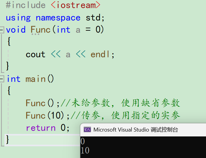 -缺省参数是声明或定义函数时为函数的参数指定⼀个缺省值。在调⽤该函数时,如果没有指定实参则采⽤该形参的缺省值,否则使⽤指定的实参,缺省参数分为全缺省和半缺省参数。(有些地⽅把缺省参数也叫默认参数)