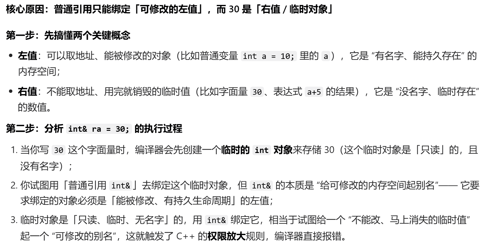 -不需要注意的是类似 int& rb = a*3; double d = 12.34; int& rd = d; 这样⼀些场景下a*3的和结果保存在⼀个临时对象中, int& rd = d 也是类似,在类型转换中会产⽣临时对象存储中间值,也就是时,rb和rd引⽤的都是临时对象,⽽C++规定临时对象具有常性,所以这⾥就触发了权限放⼤,必须要⽤常引⽤才可以。