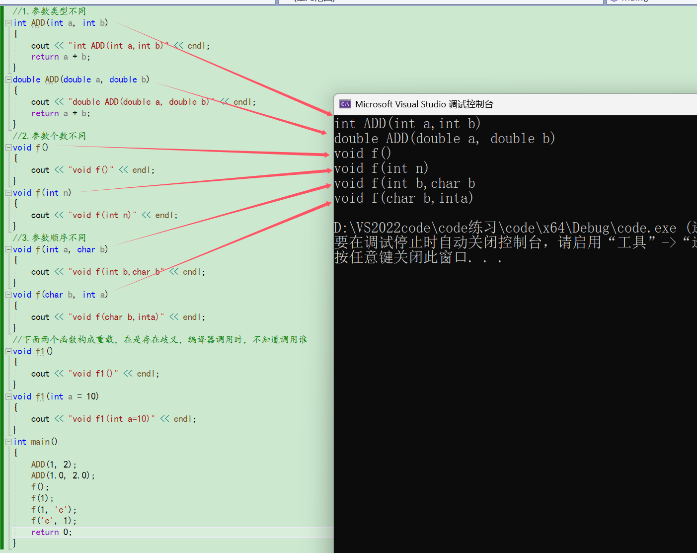 C++⽀持在同⼀作⽤域中出现同名函数,但是要求这些同名函数的形参不同,可以是参数个数不同或者类型不同。这样C++函数调⽤就表现出了多态⾏为,使⽤更灵活。C语⾔是不⽀持同⼀作⽤域中出现同名函数的。