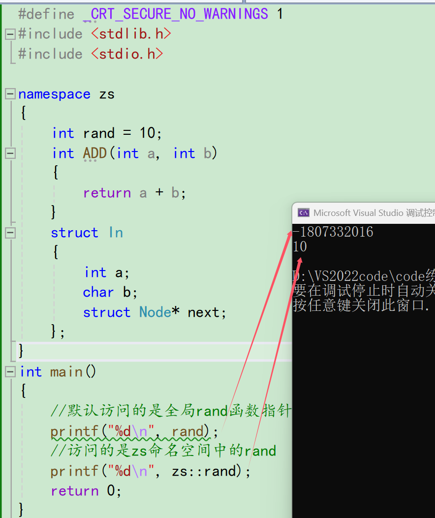 -namespace本质是定义出⼀个域,这个域跟全局域各⾃独⽴,不同的域可以定义同名变量,所以下⾯的rand不在冲突了。