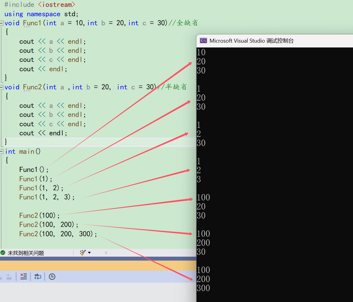 -带缺省参数的函数调⽤,C++规定必须从左到右依次给实参,不能跳跃给实参。