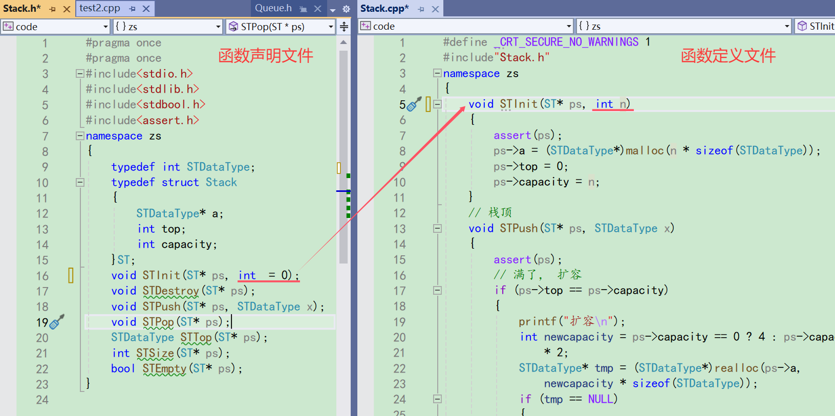 -函数声明和定义分离时,缺省参数不能在函数声明和定义中同时出现,规定必须函数声明给缺省值。
