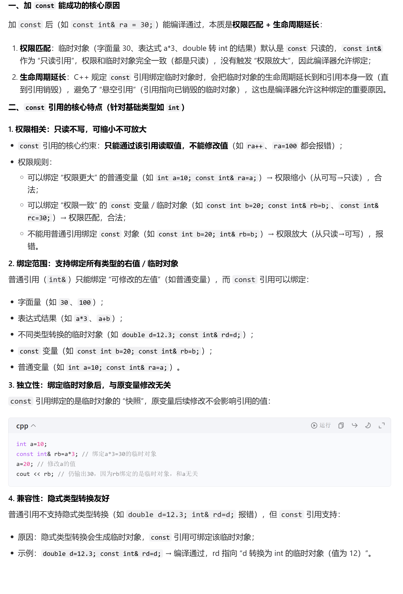 const对象(普通引用仅能绑定可修改左值);- 权限规则:仅支持权限缩小 / 匹配,禁止权限放大;