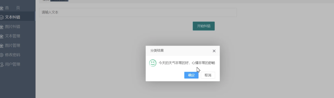 在文本纠错页面中,我们可以看到有一个文本框和一个按钮,我们可以把想要纠错的文本输入在文本框中,然后点击开始纠错按钮,经过2秒钟左右,就会在界面中弹出一个正确的纠错后的文本内容。