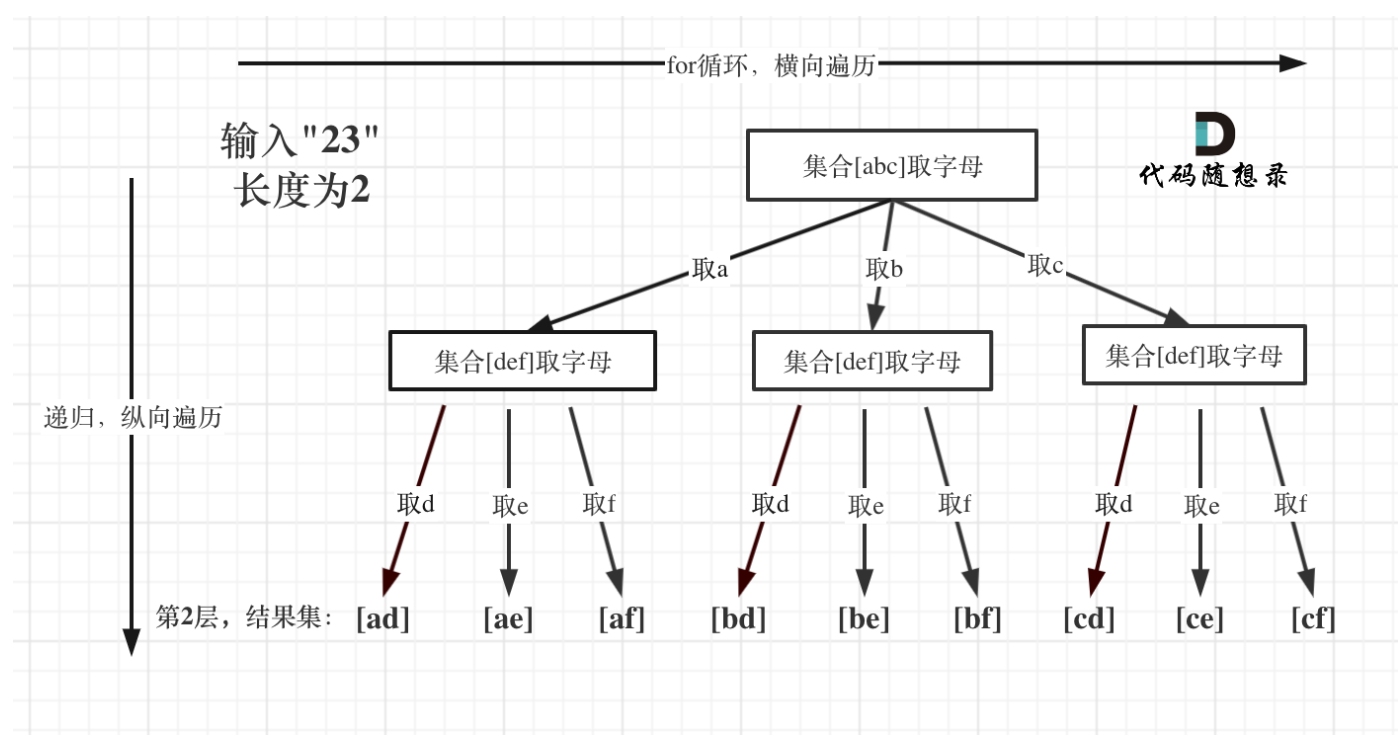 回溯函数参数:传入digits、index,index表示 "当前处理到数字字符串的第几个数字",而非普通组合的startIndex;普通组合的startIndex是为了 "去重 / 避免回头选",而这里的index是为了 "按顺序处理每个数字"(比如先处理第 0 位的 2,再处理第 1 位的 3),每一层递归对应一个数字的处理。