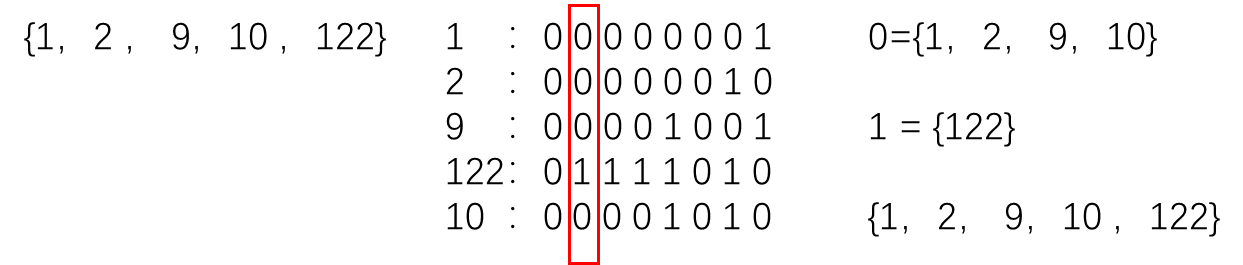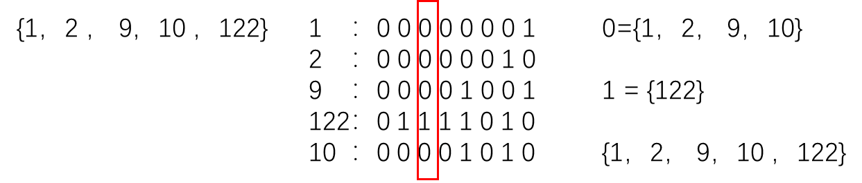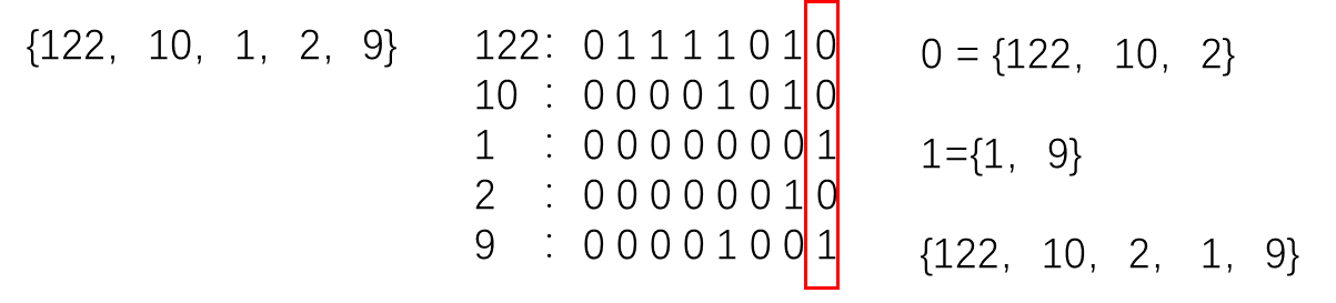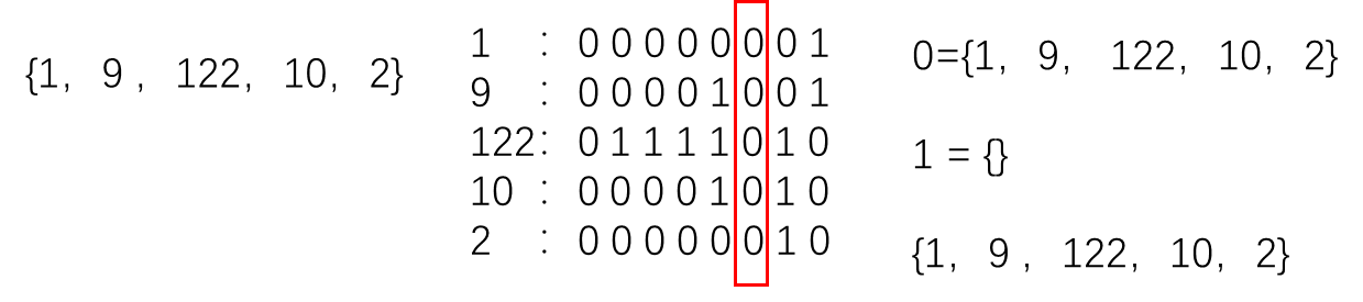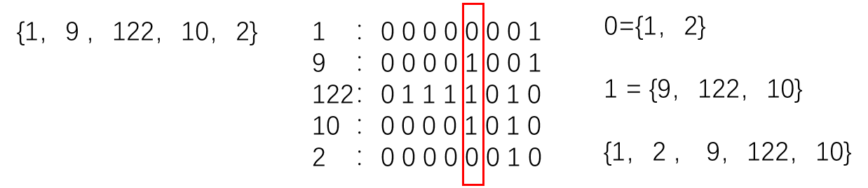 **第一轮:**最低有效位为0的元素放一起,为1的放一起