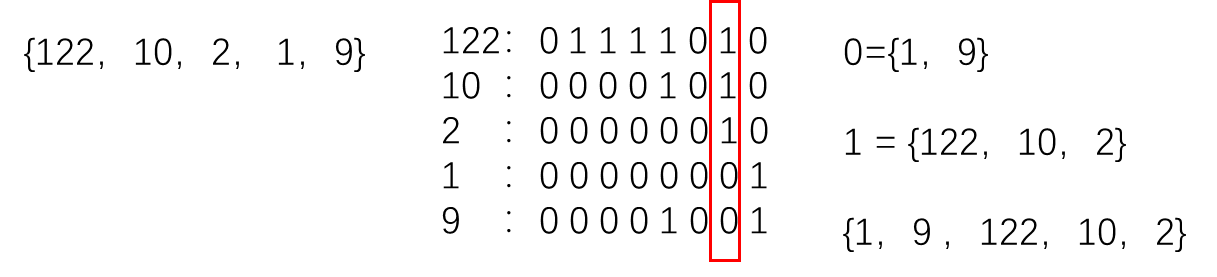 基数排序通过从最低有效位到最高有效位一一进行比较,对数值排序。对于一个32位的整型数,使用一个基数位,无论数据集有多大,整个排序需要迭代32次。按照比特位依次比较。
