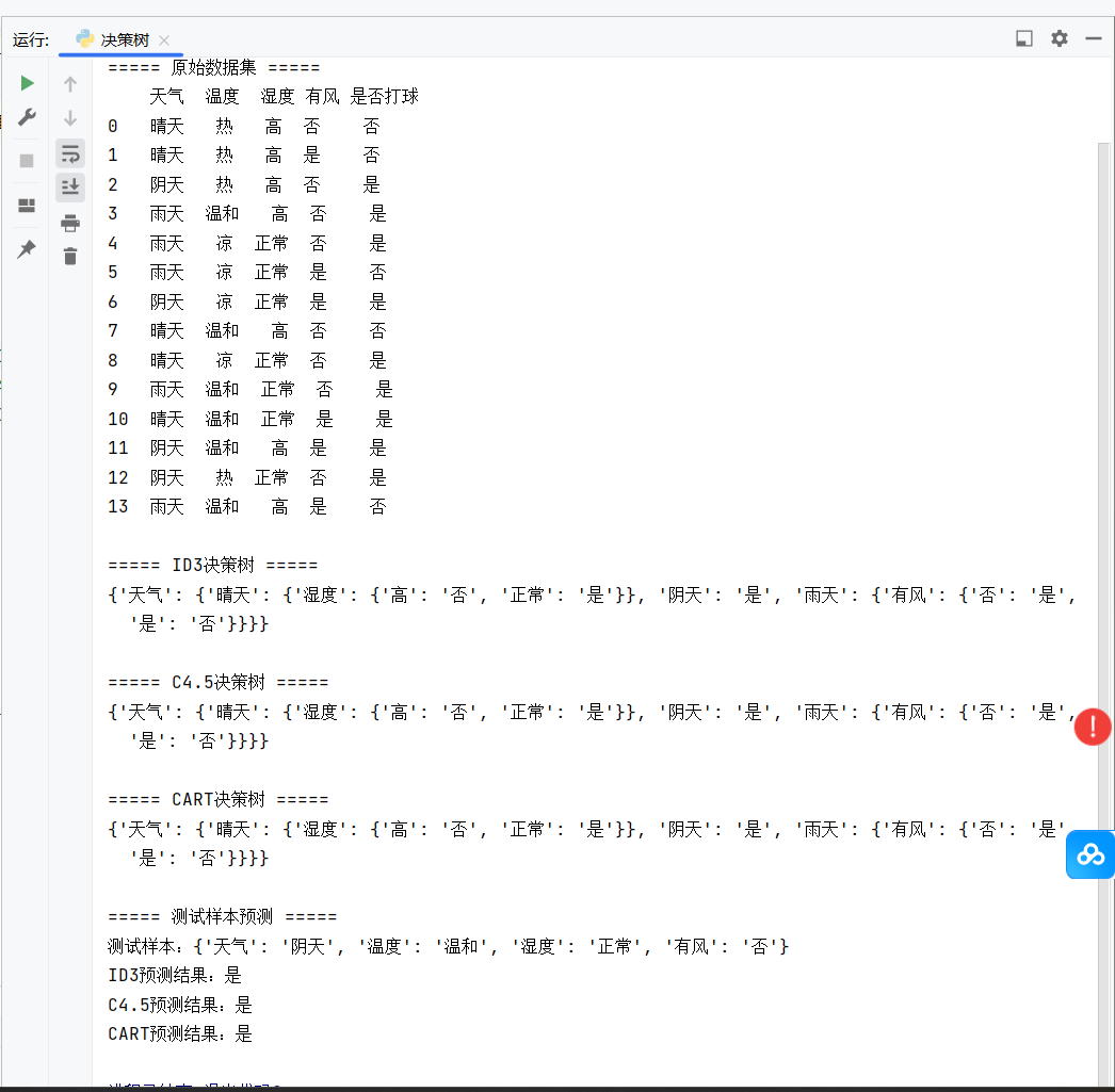 - 输出原始数据集 、三大算法的决策树结构(字典形式,直观体现节点分裂逻辑);