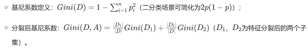 - 核心衡量指标 :基尼系数(衡量样本集合的不确定性,与熵值趋势一致,计算更高效),选择基尼系数最小的特征及切分点分裂。
