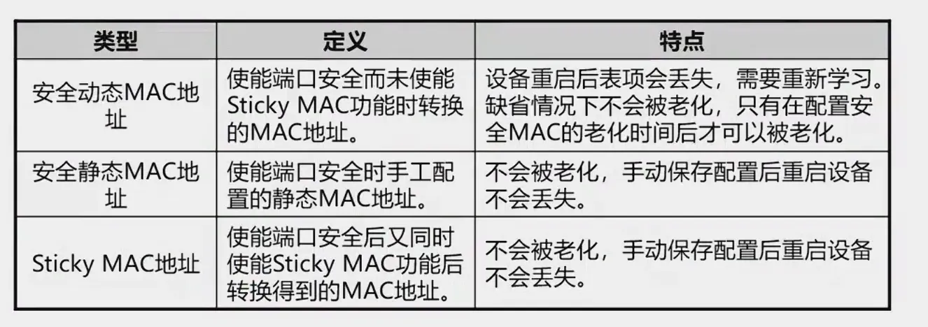 Sricky MAC,无需管理员收集的MAC地址,并假定目前用户的MAC地址是合法的,那么使用粘的功能,自动绑定动态安全MAC地址,在保持配置后,重启依然失效,减轻管理员工作量