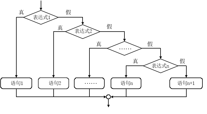 流程:对多种条件进行判断,每一种条件会执行相应的语句;当最后一个判断成立执行语句n;不成立执行else后的语句n+1