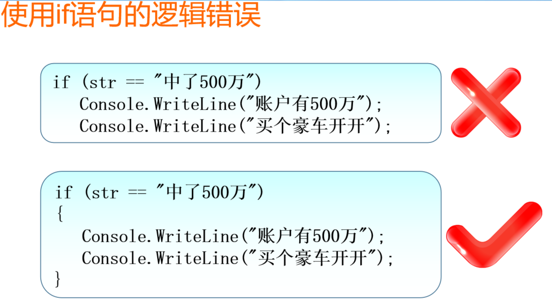 使用if语句的逻辑错误:if语句没加{} 不管满不满足都会;两条语句包含其中满足500万情况下同时执行。if语句不管有几条都会加{} --增强代码可读性,避免出现类似错误。