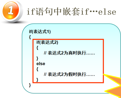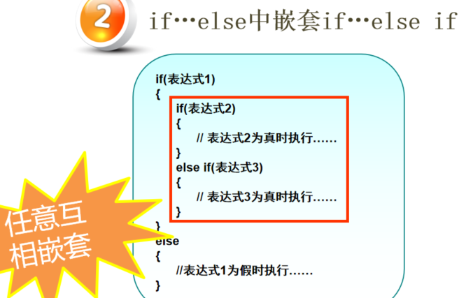 if判断表达式1 如果满足在{}嵌套if...else if...else嵌套到if语句里面 判断表达式2是否满足,满足执行为真,不满足执行为假。