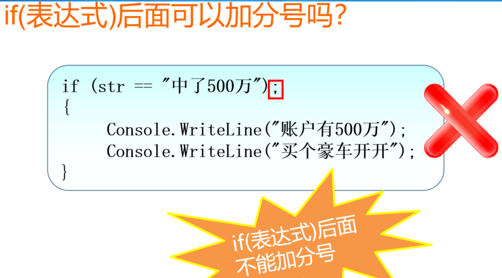 加分号相当于空语句,判断虽然中了500万,执行是空语句什么都不会做。下面不管是什么情况下都会执行。