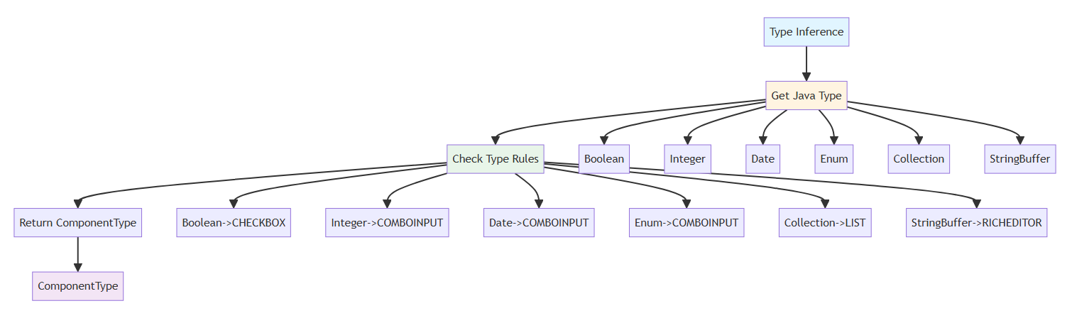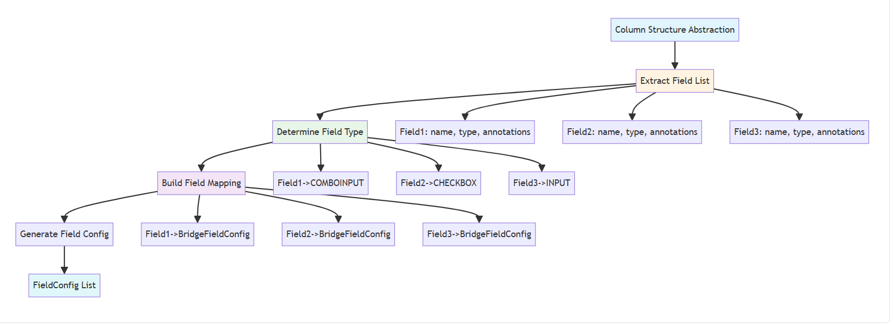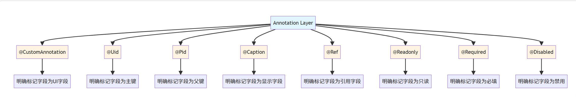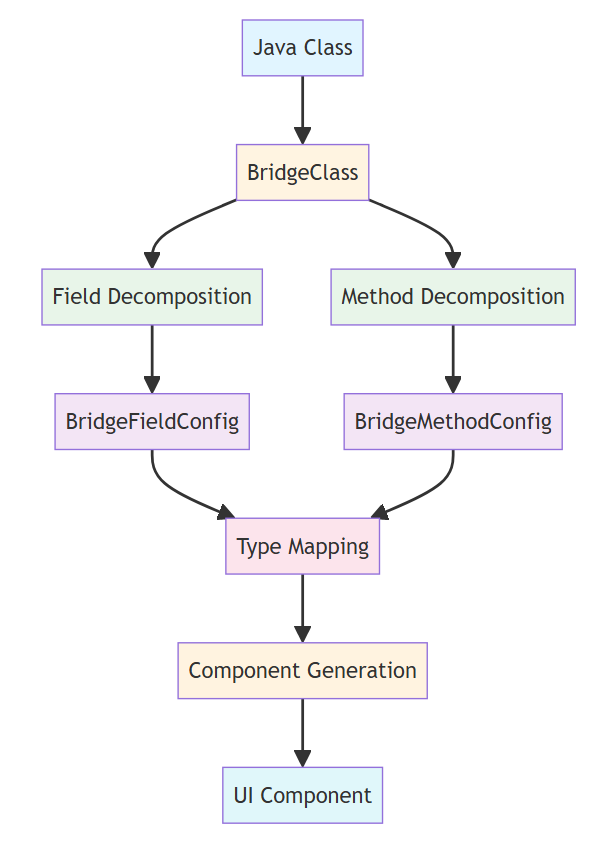 A2UI的拆解机制基于注解驱动的反射分析,通过多层次的抽象和映射,将Java类转换为UI组件。整体架构如下: