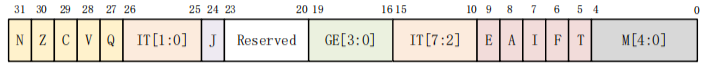 IT[1:0](bit26:25):和 IT[7:2](bit15:bit10)一起组成 IT[7:0],作为 IF-THEN 指令执行状态。